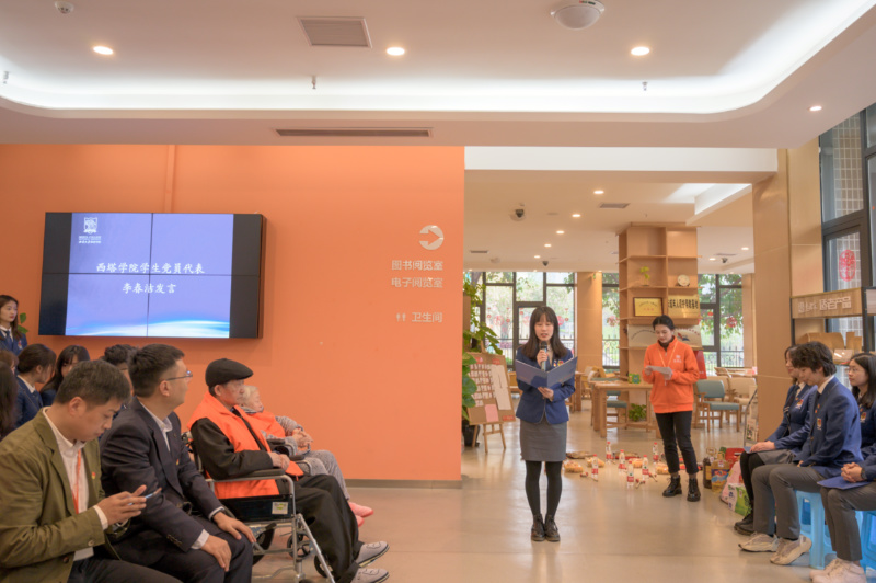 师生党员首先参观了服务中心的整体环境。服务中心负责人贺晓虎致辞,对西塔青年才俊到服务中心开展学习实践和志愿服务表示欢迎,也感谢涩涩漫画 师生多次到中心奉献爱心。学生党员代表李春洁发言,她非常感谢服务中心和涩涩漫画为西塔学子搭建的平台,表示会用心“学党史”,用情做志愿服务,用青春献礼建党100周年。