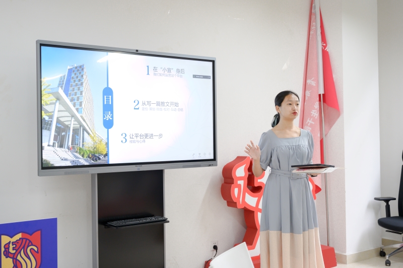 其次,青春缙云网络文化工作室副主席王静怡介绍了新媒体工作方面的建设路径,她指出,平台定位是新媒体建设的首要前提,讲好故事需要精准定位新媒体的核心受众,满足受众需求,提供新鲜内容和特色文化。她强调了运营公众号要“三位一体”,从明晰目的、彰显特色、构建逻辑三维上,高度重视受众互动和评论机制的建设,在批判和自我批判中成长。