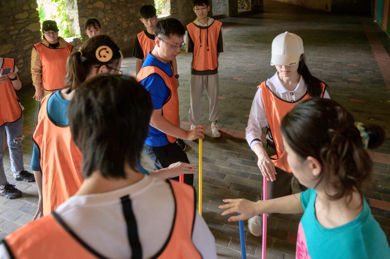 每个小组在规定的时间内,完成“不倒森林”“马甲传递”“团队拍手”3个子项目游戏,各子项目游戏由不同数量的队员参与。两队进一步认识到有限资源需要合理配置,树立了合分工协作,积极配合的团队意识,也培养了正确认识工作任务的心态和敢于挑战任务的责任感。
