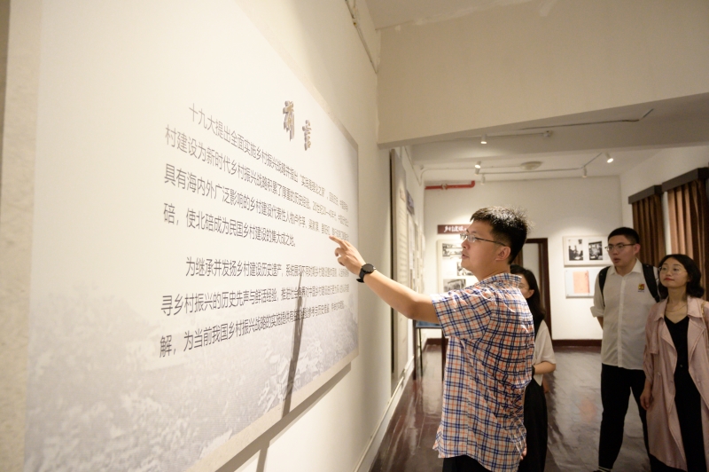 随后,张琨副书记带领师生们参观乡村振兴的发展探索纪念馆,向大家讲解中国乡村建设运动的历史。张书记讲到,在那样一个民生凋敝的年代,一批具有爱国热忱的有识之士纷纷投身推动乡村建设运动,探索社会治理的道路。无论是主张“实业救国”的张謇、“生活即教育”的陶行知、“学校不是培育学生而是教学生如何去培育社会”的卢作孚,还是中国平民教育家晏阳初、运用儒家文化助力乡村建设的梁漱溟、原川东师范学校校长甘绩镛,他们都大力发展乡村教育、卫生事业,为改变中国乡村面貌作出卓越贡献。
