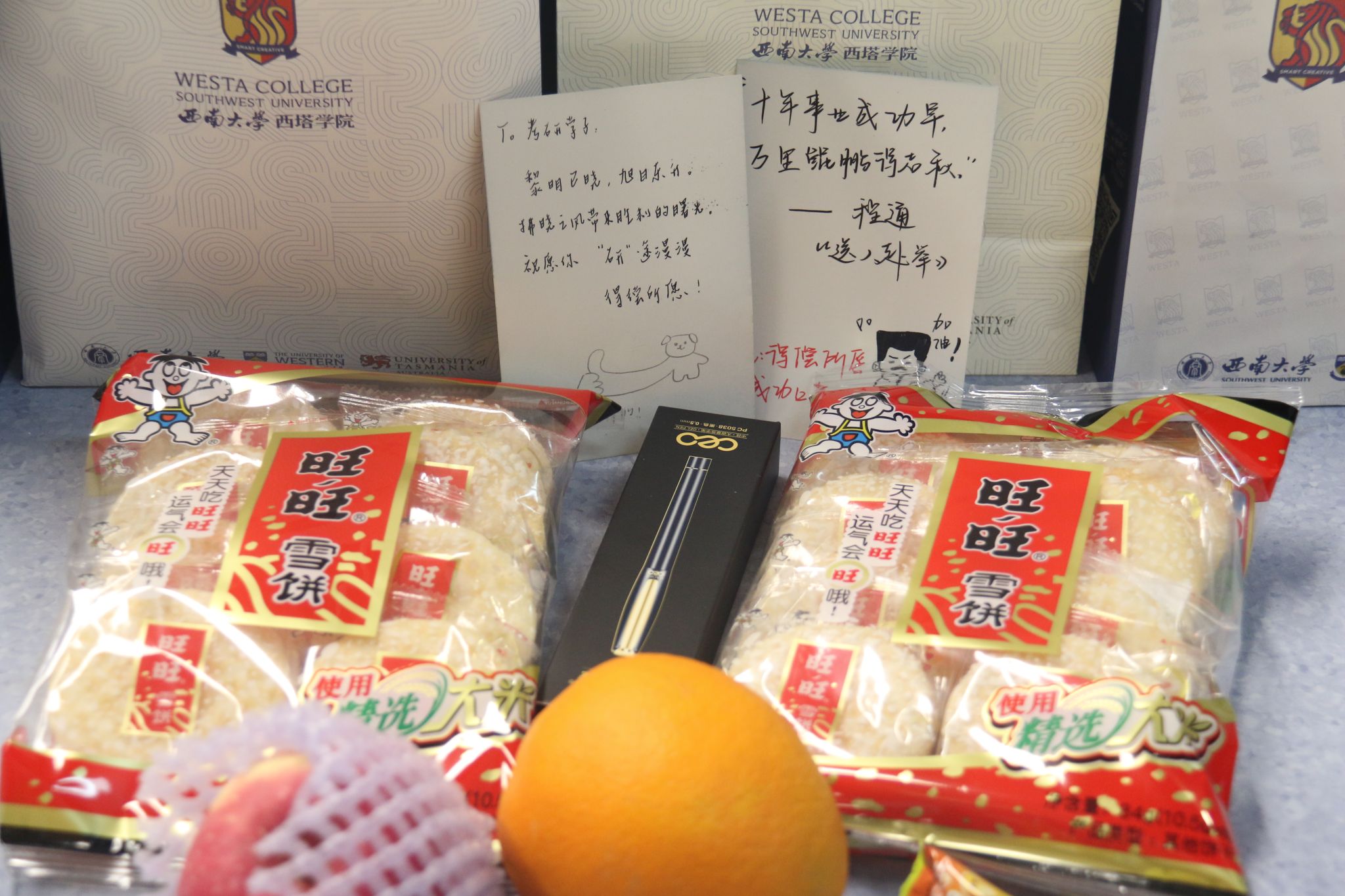 随后,学院领导将“考研爱心加油包”送到每位学子手中,礼包里的每一份礼物都承载着学院的深切关怀,愿学子们“苹”心备考,考运“旺旺”,发挥超“棒”,“笔”定上岸,“橙”功圆梦。