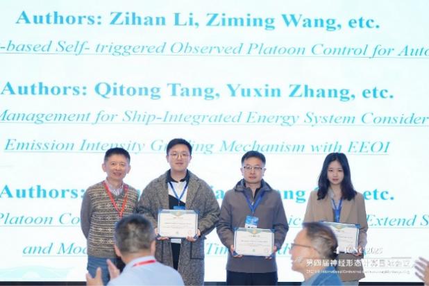 李子涵同学在王欣教授的指导下,向大会提交高质量论文《Neural-network-based Self-triggered Observed Platoon Control for Autonomous Vehicles》并完成全英文学术汇报,以扎实的科研功底、清晰的逻辑表达与出色的应变能力,赢得参会专家的高度认可。