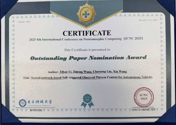 汇报中,李子涵系统阐述了自动驾驶车辆队列控制技术的核心价值——作为智能交通系统的关键支撑,该技术可有效提升道路通行效率、降低能耗并保障行驶安全。但该技术在实践应用中仍面临车辆动力学不确定性与通信间歇性等问题带来的挑战。为解决这一问题,她提出了融合反步设计、非线性采样数据观测器、径向基函数神经网络和自触发通信机制的自适应一致性跟踪控制框架,为实际网络化车辆系统提供了高效解决方案。在答辩环节,李子涵流畅回应行业专家的提问与点评,展现出对研究课题的深刻洞察,并最终斩获优秀论文提名奖。会议结束后,由IEEE Fellow香港城市大学冯刚教授亲自为其颁奖。