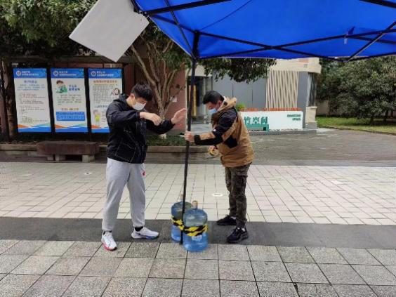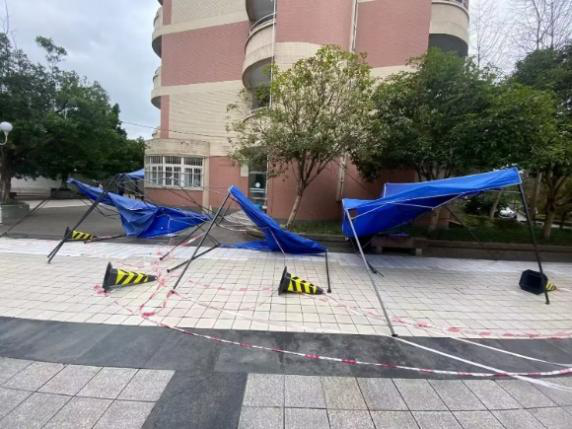 11月11日晚至12日早上,一场暴雨将竹园二区核酸采样点几乎所有的帐篷刮倒在地,一部分甚至损坏不能使用。据他回忆,当时风太大,帐篷根本稳定不住,在涩涩漫画党委滕超副书记的带领下,他们就地取材,搬了20余桶桶装水固定帐篷,并配合剪刀、胶带、螺丝刀等工具……最终在当前核酸采样时间前成功修复核酸采样点。
