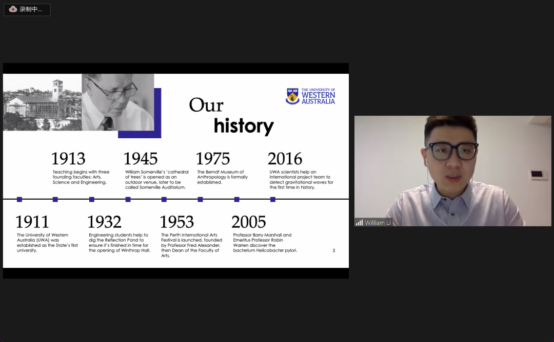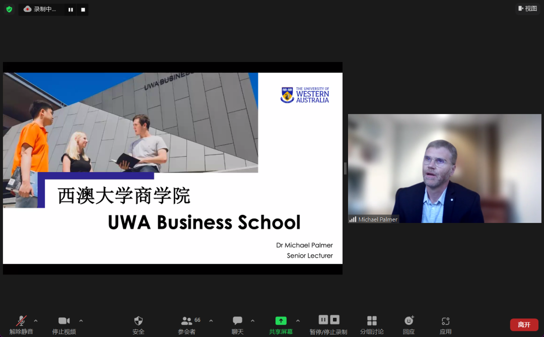 西澳大学校长Amit Chakma教授通过视频,向涩涩漫画2022级新生作了欢迎致辞。Michael Palmer博士分享了商涩涩漫画概况,回答了同学们所关心的问题,就经济学专业实力、就业前景、课程体系、师资情况等方面进行介绍,并鼓励学生们主动与澳方老师进行沟通与交流。William Li对西澳大学、珀斯城市概况进行介绍,并详细介绍了2023年西澳大学奖学金政策及国际学生支持服务。