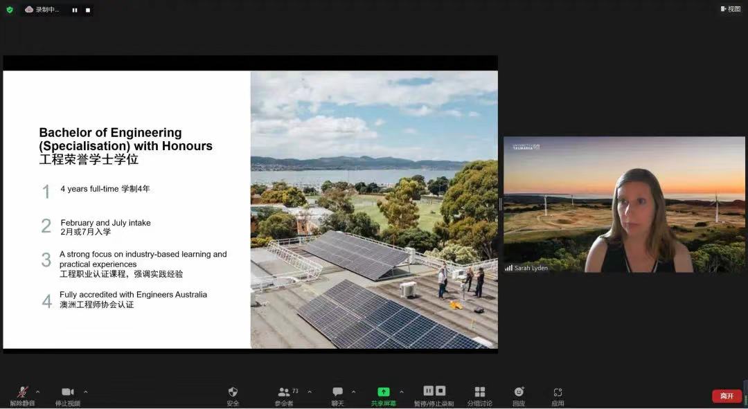 Tim Finnigan院长代表塔斯马尼亚大学工程涩涩漫画对2022级新生表示欢迎,他分享了塔斯马尼亚大学及工程涩涩漫画概况,就本专业科研实力、就业前景、校园环境、霍巴特环境等进行介绍;Terry Bailey执行院长就课程信息、专业前沿信息、师资情况进行分享;Sarah Lyden博士鼓励西塔学生积极与外方教师交流,重视英语学习,打牢专业基础。会上,塔斯马尼亚大学相关负责人通过视频、图片素材等为学生们展示美丽的校园环境与先进的实验室环境。已赴塔大学习的西塔学长们热情地分享个人在当地学习生活的经历,并寄语新生。
