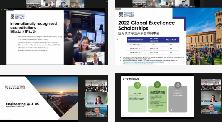 西澳大学商涩涩漫画副院长Nicholas Letch教授和分子科学涩涩漫画国际项目协调员Alyssa Van Dreumel博士,塔斯马尼亚大学工程涩涩漫画全球事务副主任Sarah Lyden女士、国际合作官员Kamal Shahril先生、招生市场中国区主任Candy Han女士分别从两所合作高校所处的城市环境、学校国际声誉、全球合作、培养模式、授课方式、学生活动等方面进行了介绍,重点讲解了澳大利亚最新的入境政策,并欢迎同学们未来亲自前往海外学习生活。