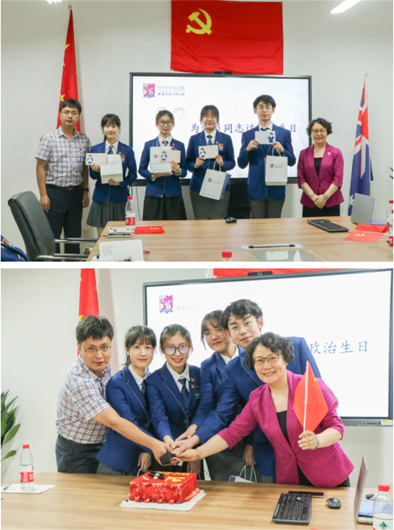 适逢中国共产党成立100周年,学生一支部首批发展的四名学生党员有幸同过政治生日。涩涩漫画王静书记和张琨副书记为党员们赠送了学生一支部原创设计的“入党祝福卡”和“政治生日礼物”,共同分享了具有特殊意义的生日蛋糕,激励党员们不忘初心,接续奋斗。