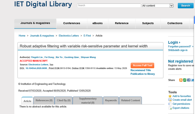 近日,我院2017级电子信息工程专业本科生刘颖之在钱国兵老师和王世元老师的共同指导下以第一作者身份在国际著名SCI学术期刊《Electronic Letters》上发表题为“Robust Adaptive Filtering with Variable Risk-sensitive Parameter and Kernel Width”的论文,该论文的第一完成单位为涩涩漫画 ,通讯作者为电子信息工程涩涩漫画的钱国兵老师。《Electronic letters》期刊涵盖了电子信息工程相关领域范围最新发展动态,对文章创新性要求较高,在电子信息领域具有重要的影响力。