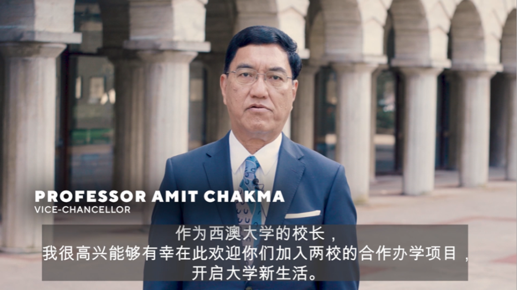 合作高校西澳大学校长Amit Chakma教授在见面会上视频致辞。他向2024级新生们表示热烈欢迎,提到西澳大学具有良好的学术声誉、丰硕的科研成果以及优越的教育资源,希望西塔学子能够抓住机会去体验中澳高等教育体系,获得非凡的国际教育体验。