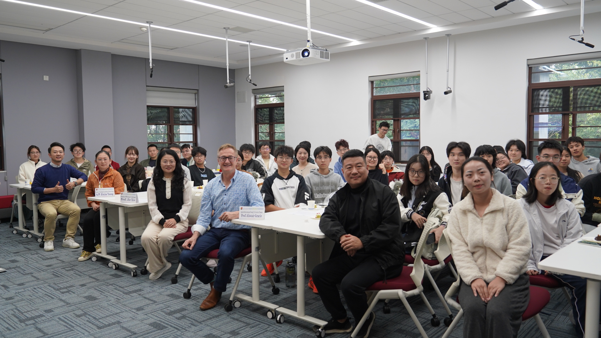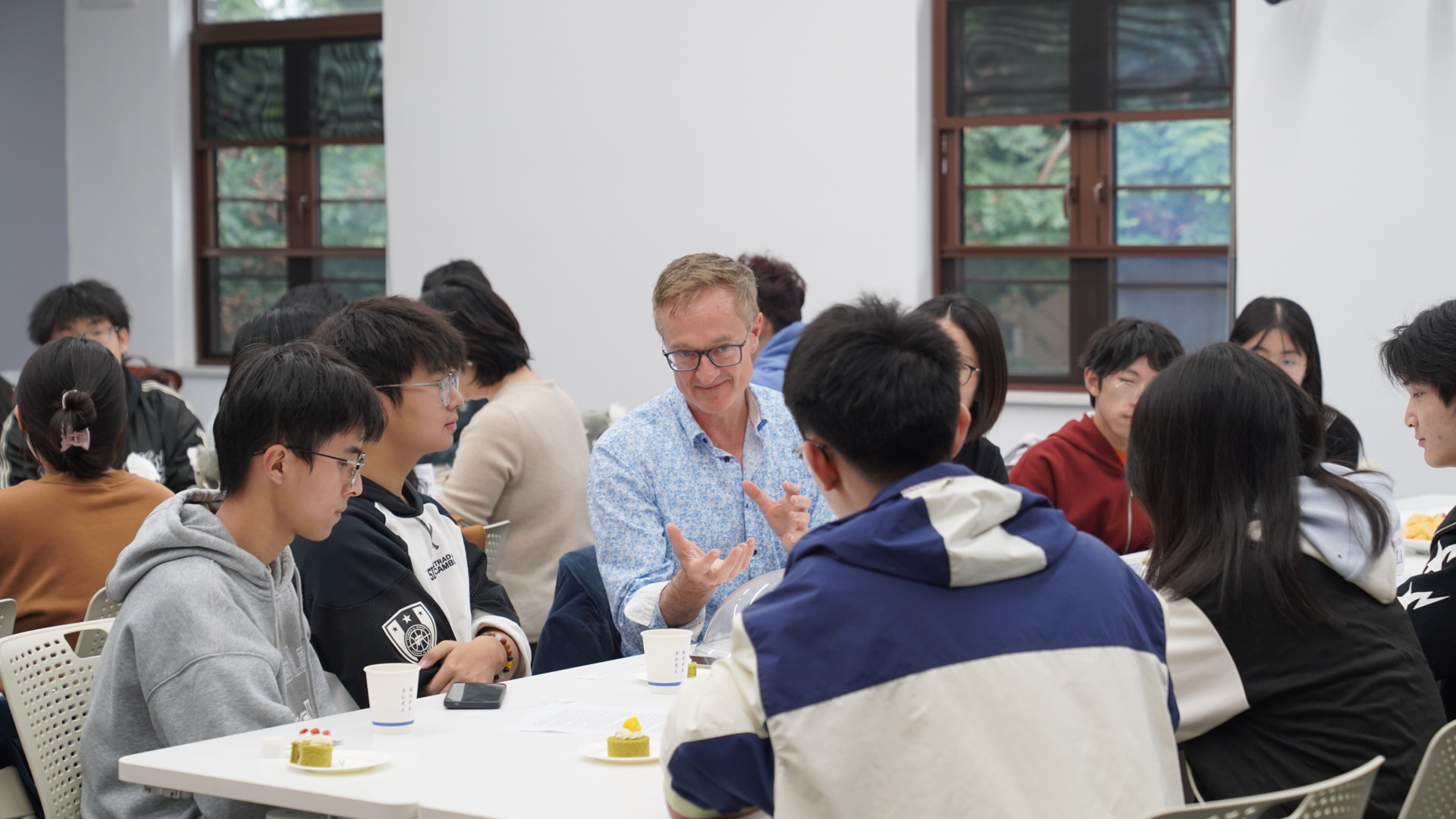 随后,师生围绕学生感兴趣的四大主题积极提问、热烈互动。Alistair Gracie副院长就“Scientific Research Trends and Insights in Food Science”主题,细致回应了科研入门路径、实验技能培养、学术兴趣激发等学生提问;谢洁院长围绕“Cross-cultural Communication and International Perspective”主题与同学们展开关于英语能力提升、跨文化能力培养、国际交流与个人发展等话题的交流;滕超副书记针对“Future Planning and Core Competitiveness”主题,对大学四年阶段重心分配、学业与社团活动平衡、中外合作资源高效利用等实际困惑给出建议;杨吉霞老师则聚焦“Further Education and Career Choices”,就毕业生就业方向、国内外读研差异、食品行业新兴职业机会等内容与学生们展开探讨。