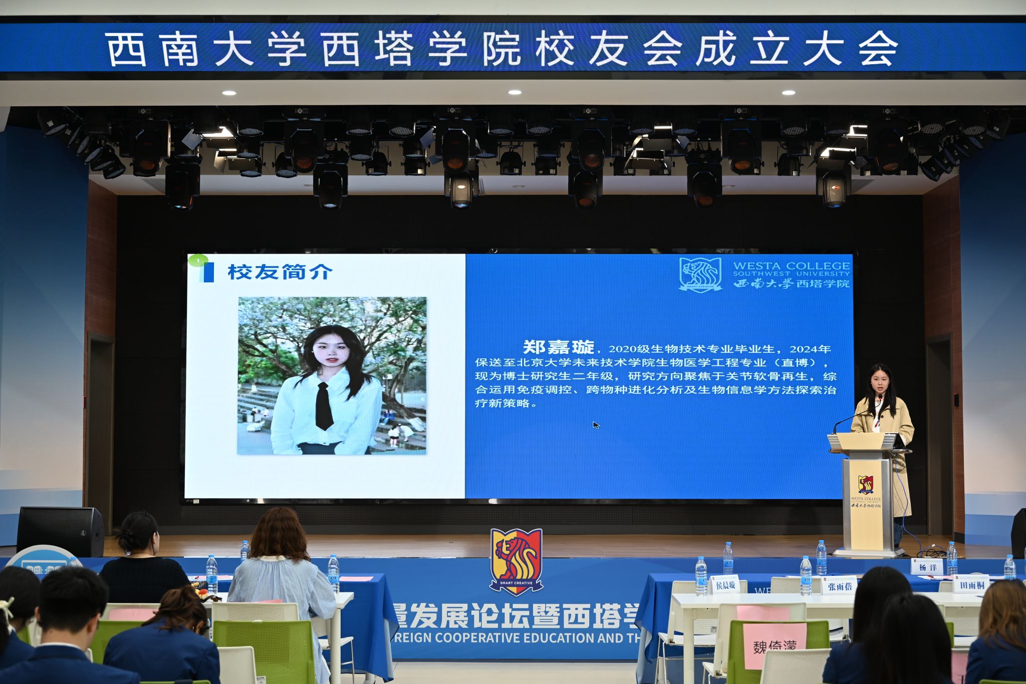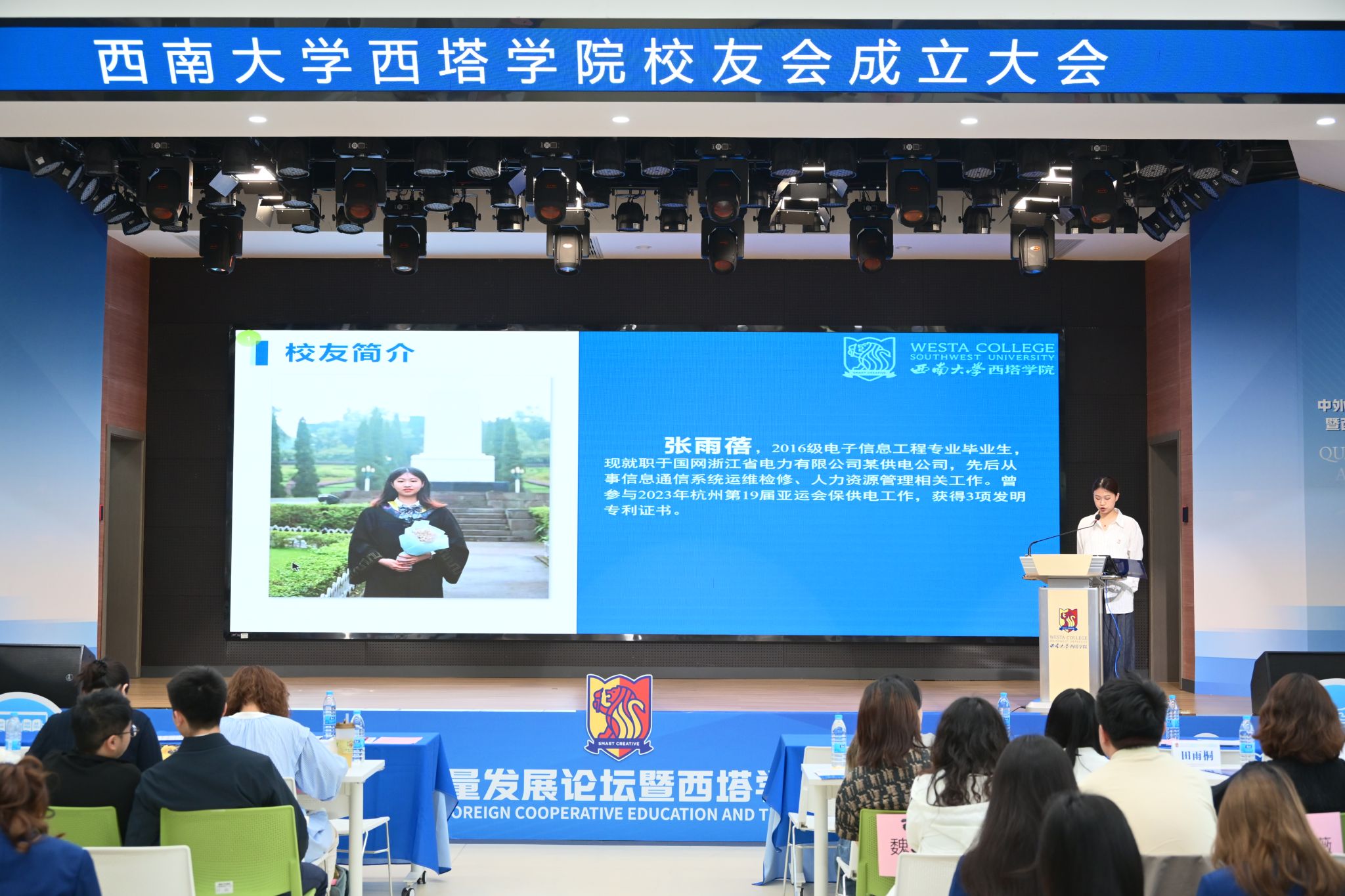 2017级电子信息工程专业校友田雨桐,如今是电子科技大学博士研究生。他以“扎根川渝,电磁筑梦”为题,回顾了自己从西塔本科求学、斩获国家级竞赛奖项,到投身科研一线、矢志攻关关键技术的成长历程。他勉励同学们,要厚植家国情怀,锤炼硬核专业本领,以国际视野投身国家战略需求,用青春担当为百廿西大、十年西塔献礼。