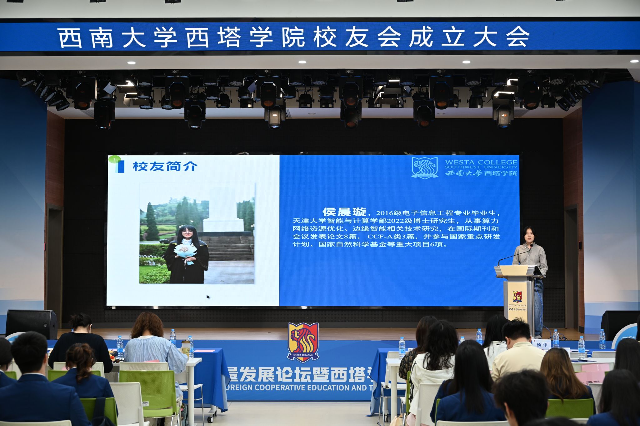 2016级电子信息工程专业校友侯晨璇,现为天津大学智能与计算学部博士研究生,专注于算力网络资源优化、边缘智能技术研究。她以院徽“Smart Creative”为引,提出“不被动完成任务,要主动塑造自己”的成长理念,鼓励同学们在多元发展的选择中主动思考、积极探索,以奋进姿态传承西塔精神,不负十年院庆荣光。