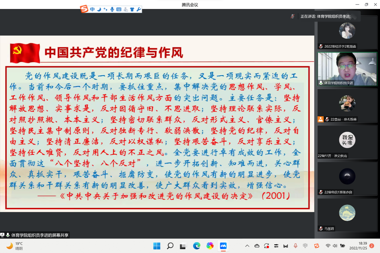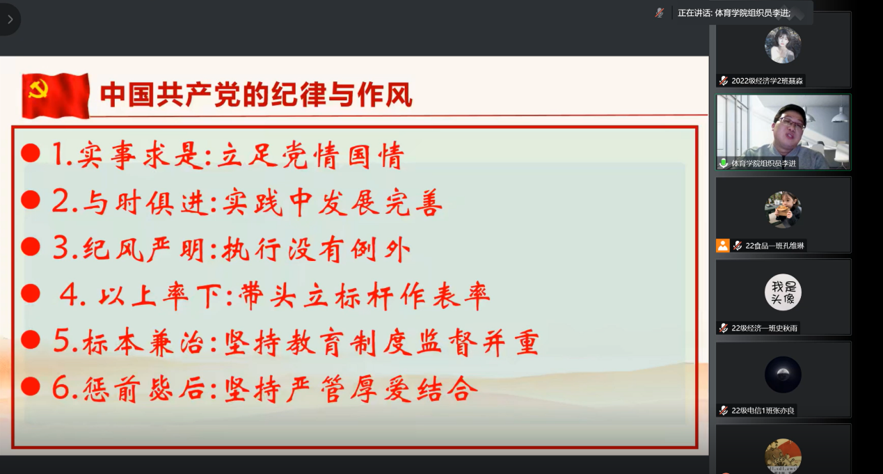 11月25日晚,涩涩漫画邀请到体育涩涩漫画正科级组织员李进为第七期入党积极分子暨第四期大学生骨干培训班线上讲授“中国共产党的纪律与作风”专题党课,涩涩漫画正科级组织员秦蓉和全体培训班学员认真聆听。