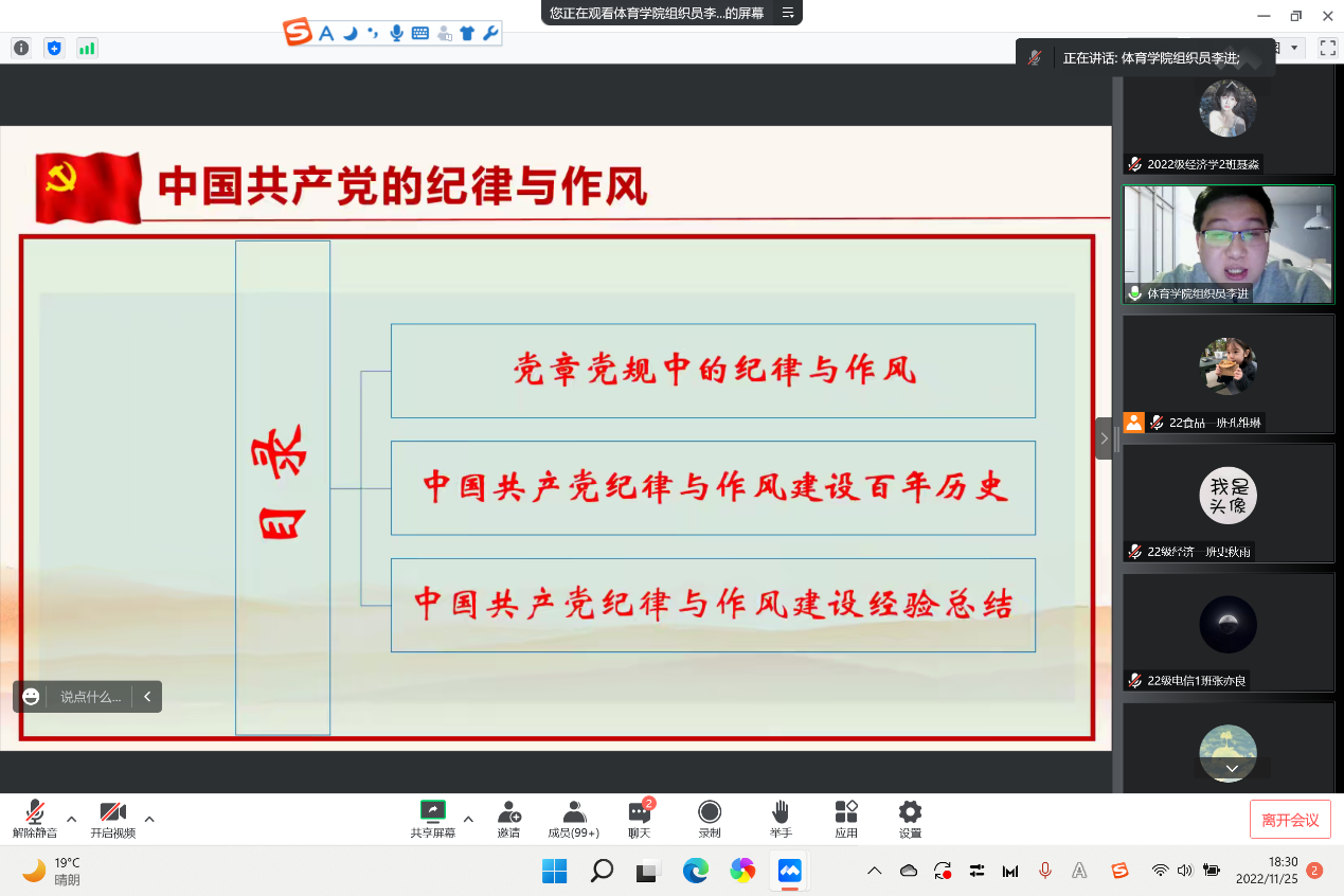 李老师分别从党规党章的纪律与作风,中国共产党纪律与作风建设百年历史,中国共产党纪律与作风建设总结经验这三个方面讲述该党课内容。