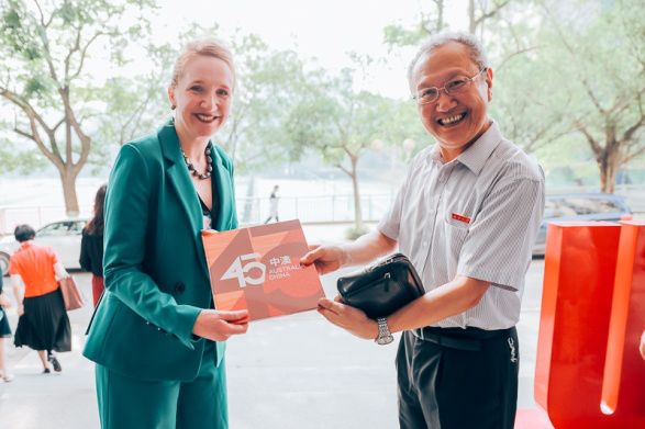 最后,贺蓉歌女士代表澳大利亚向梁光志书记赠送《中澳建交45周年》纪念册。涩涩漫画师生与客人们在涩涩漫画门前合影,共同留念这一美好的时刻。