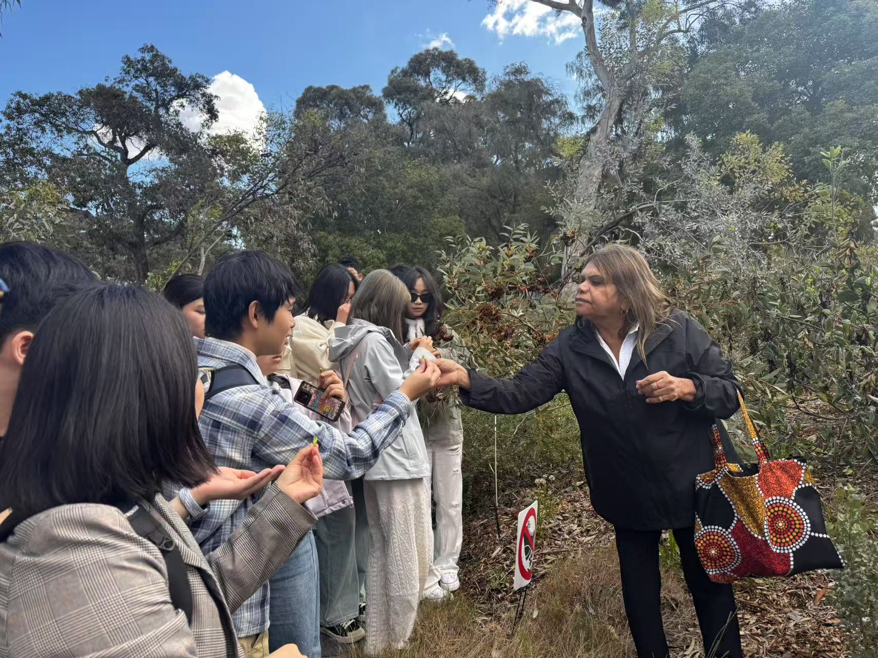 第一站,同学们来到了国王公园实地考察,这里远不止是一座展示大自然的博物馆,更承载着当地原住民厚重而悠久的历史。我们有幸邀请到了祖孙三代原住民,他们用朴实而生动的语言,为我们讲述着他们的祖先在国王公园的历史。从古老的部落文化,到与现代社会的交融碰撞,每一个故事都仿佛带着我们穿越了时光的隧道,让我们深刻感受到土著文明的坚韧与传承。公园内的植物种类繁多,其中3000种是西澳特有的野花植物,令人大开眼界。在原住民的介绍下,我们认识了许多独特的植物,并品尝了部分具有药用价值的植物。