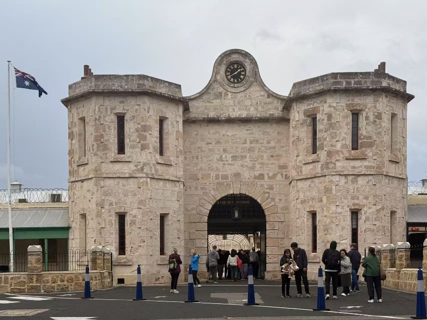 下午,众人来到弗里曼特尔监狱。一进门,讲解员便幽默地说:“欢迎来到监狱!”他带着大家走过阴暗的牢房、狭窄的走廊,讲述着这里曾经发生的故事——囚犯们如何试图越狱、狱警们如何与他们斗智斗勇。最让人惊叹的是,他提到一位“逃脱大师”曾两次成功越狱,甚至还被拍成了纪录片。同学们被他风趣的讲解逗得哈哈大笑,原本阴森的监狱顿时充满了欢乐气氛。