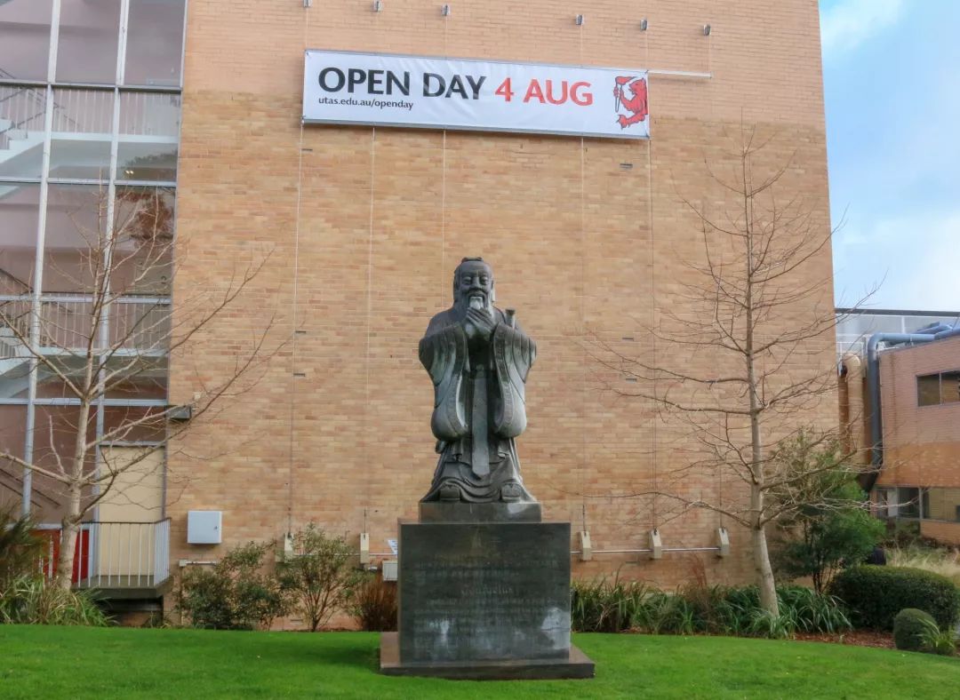 中国著名思想教育家孔子的塑像也立于校园的显眼之处,引来往学生纷纷驻足。