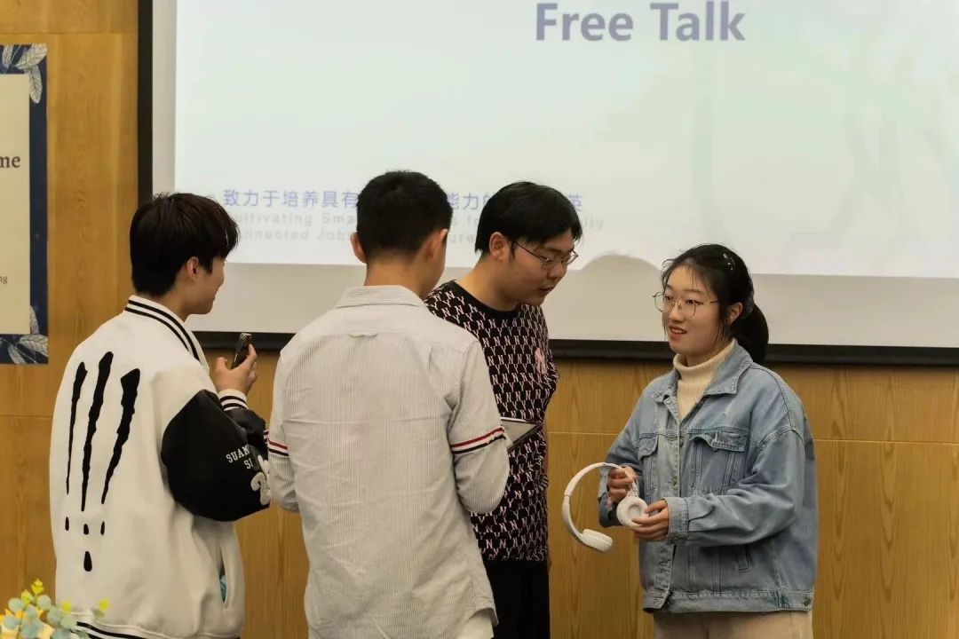 在随后的Free Talk环节中,同学们积极提出自己学习上的困惑。在场的两位领导共同为同学答疑解惑,并分享自己的求学经历,鼓励同学们坚持“不积跬步,无以至千里;不积小流,无以成江海”。活动还通过“英文传话”小游戏,现场测试了同学们的英语口语水平,同时促进了大家的团队协作能力。现场氛围欢快和谐,同学们都表示受益匪浅。