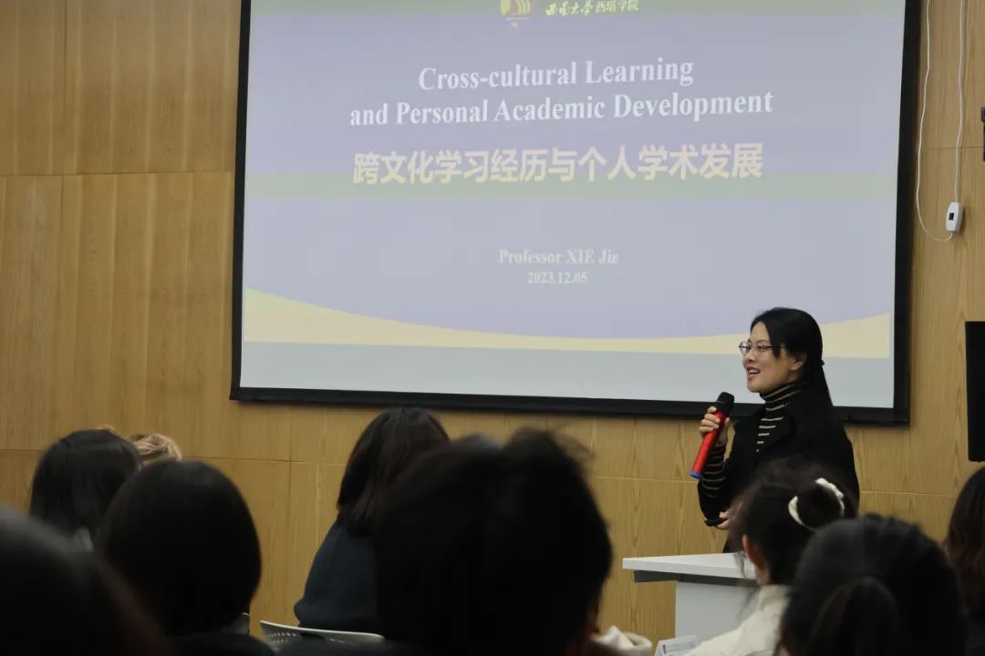 谢洁院长从“Who are we?”提问出发,用生动形象的图片与案例启发同学们对跨文化的思考与理解。她以自己赴美做访问学者期间的经历为例,从个人学术成长、跨文化学习与交流能力、批判创新思维养成等多角度向学子们阐明了开展多元文化交流和学习的重要性。最后,她通过介绍涩涩漫画为培养具有全球择业能力的创意精英系列举措,鼓励学子们要不断挑战和突破自我,实现从西塔走向世界舞台的飞跃。